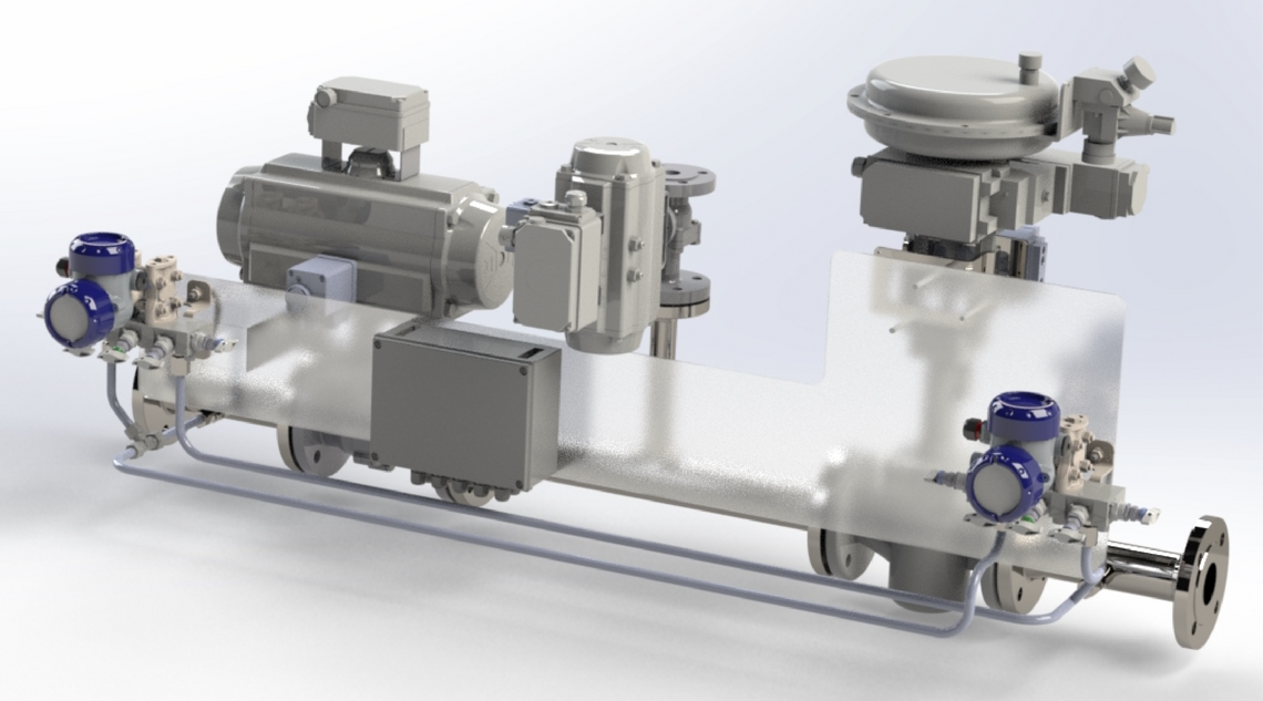 The single-channel check valve consists of a control valve and a differential pressure gauge, and monitors the flow through the valve assembly using a differential pressure transmitter. If a defined limit is undershot, backflow against the flow direction can no longer be excluded. The single-channel check valve safely shuts off the pipeline in a safety-related manner.